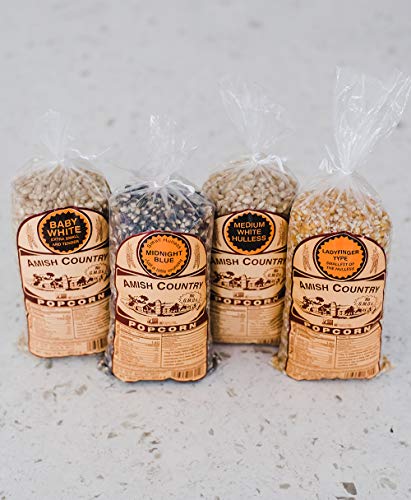 • Amish Country Popcorn | 4 - 1 lb Bags | Variety Pack | 1 lb Baby White -1 lb Medium White - 1 lb Ladyfinger and 1 lb Midnight Blue Popcorn Kernels | Old Fashioned with Recipe Guide (4 - 1 lb Bags)