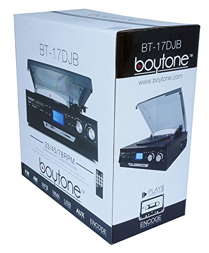 • Boytone BT-17DJB 3-speed Stereo Turntable, 2 Built in Speakers Digital LCD Display AM/FM Radio, USB/SD Slot, AUX+ MP3 & WMA Playback /Recorder & Headphone Jack + Remote Control,Black