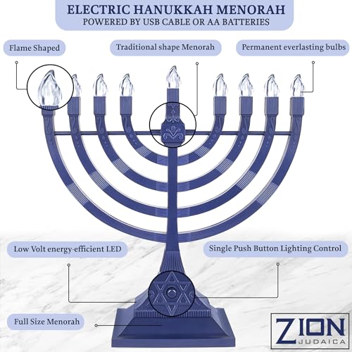 • Zion Judaica Blue Electronic Hanukkah Menorah Powered by Batteries or USB 4' Cable Included Flameless Chanukkah Candles Holder LED Electric Minorah Bulbs Chanukah Deco Chanukkiah