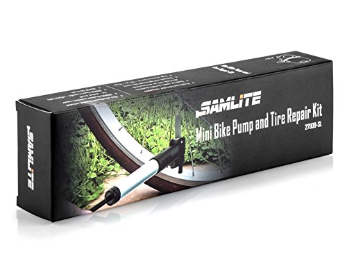 • SAMLITE Best Handheld Mini Bike Pump with Glue-Less Puncture Repair Kit, Fits Presta and Schrader Valve, Includes Mount Kit, High Pressure 120 PSI, 8 Bar, Free Bike Bell and Sports Needle Included