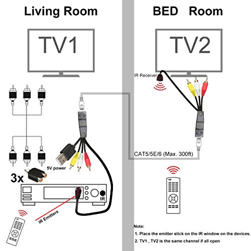 • Relper-Lineso TV 3 RCA A/V and USB IR Remote Control Extender Kit Over CAT5/6 for Controlling DVD/Set-Top Box from Another Room (A/V 3RCA + USB IR Extender with Power)