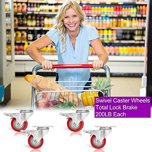3" Caster Wheels, PRITEK Heavy Duty Plate Casters with 360° Swivel and Lockable Top Plate No Noise Rubber Base Ball Fit for Furniture Industrial Table Cabinet Shelves (bearing 200lb each, set of 4), Red