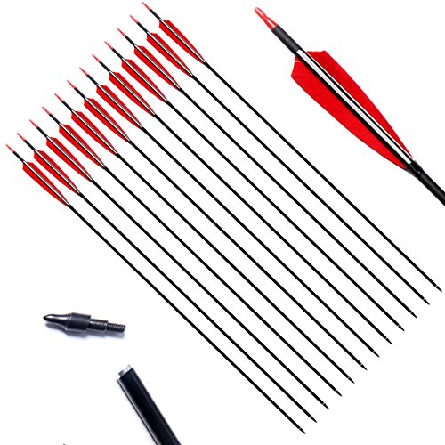 • PG1ARCHERY 30 Inch Archery Hunting Target Arrows, Carbon Arrows 5" Shield Feather Fletching with Replacement Screw-in Field Points for Recurve & Long Bow (12 Pack) Red