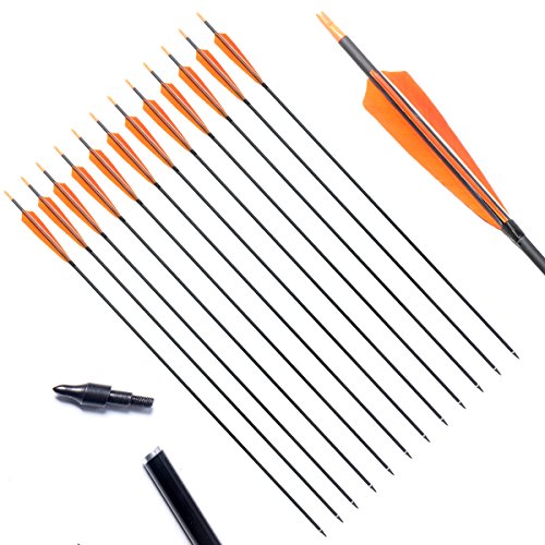 • PG1ARCHERY 30 Inch Archery Hunting Target Arrows, Carbon Arrows 5" Shield Feather Fletching with Replacement Screw-in Field Points for Recurve & Long Bow (12 Pack) Orange