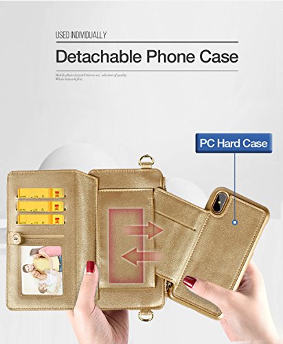 iPhone XS Max Case, SINIANL 2 in 1 Leather Zipper Wallet Multi-functional Handbag Detachable Clutch Case with Folio Flip Credit Card Holder Cover Buckle Purse for iphone XS Max, womens, Gold