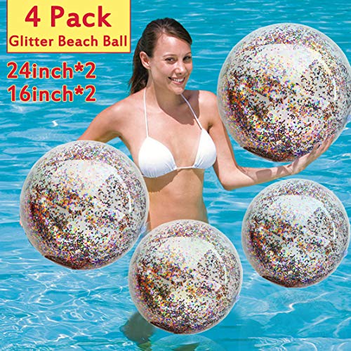 • 4 Pcs Sequin Beach Balls Jumbo Pool Toys Balls for Kids Adult Pool Party Favors Ball for Outdoor Indoor Summer Water Fun Toys Confetti Holographic Glitter Beach Ball Inflatable (2 Pcs 24" + 2 Pcs 16")