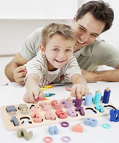 • Wooden Counting Shape Stacker Puzzle Board - Montessori Preschool Educational Math Number Blocks Sorting Stacking Tower Toy for Kids Toddlers 3 Year Old