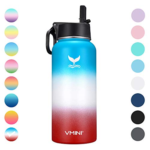 • Vmini Water Bottle with New Wide Handle Straw Lid, Wide Mouth Vacuum Insulated 18/8 Stainless Steel, 32 oz, Gradient Blue + White + Red