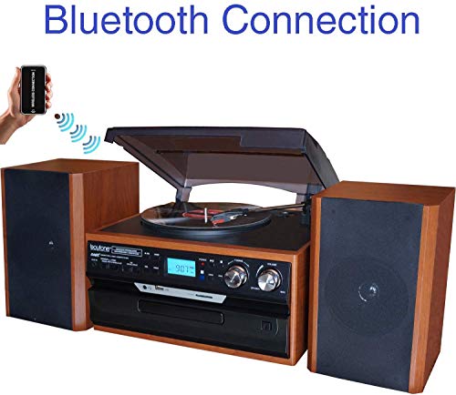 • Boytone BT-24MB Bluetooth Classic Style Record Player Turntable with AM/FM Radio, CD/Cassette Player, 2 Separate Stereo Speakers, Record from Vinyl, Radio, and Cassette to MP3, SD Slot, USB, AUX. Product description:
