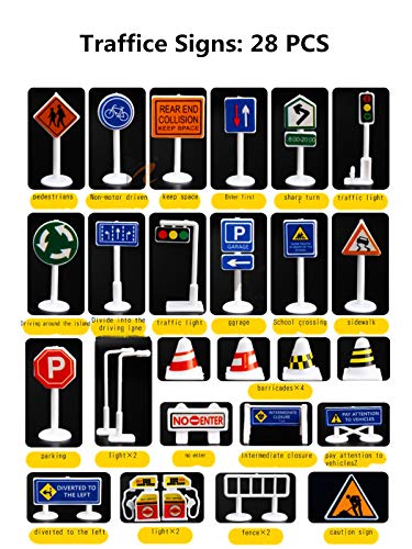 • Pull Back Vehicles, Car Toys Set with Play Mat, 6 Pcs Vehicles, 28 Pcs Road Signs and Playmat, Vehicle Educational for Children Boys Party Favors, Birthday Game Gift Playset Classroom Reward