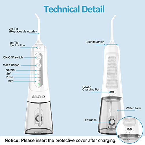 • Water Flosser, Cordless Electric Oral Irrigator, 300ML Portable and Rechargeable Dental Teeth Cleaner for Travel & Home, RENPHO 4-Mode IPX7 Waterproof Flossers with 5 Jet Tips, Braces, and Bridge Care