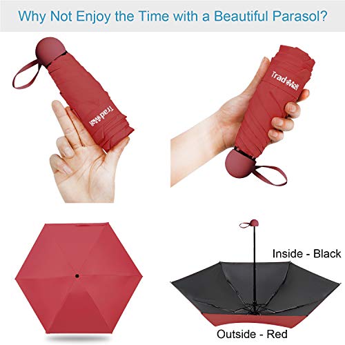 • TradMall Mini Travel Umbrella, 6 Ribs Portable Lightweight Compact Parasol with 99% UV Protection for Sun & Rain, Red