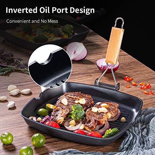 • SKY LIGHT Grill Pan, 11 inch Portable Nonstick Frying Pan for Steak, Fish and BBQ, 3.5 mm Forged Deep Square Griddle Pan with Easy Grease Draining, Filter, Folding Handle Induction Skillets