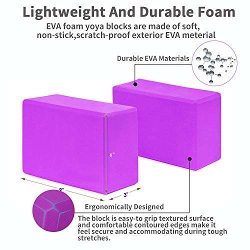 Sunrich Yoga Blocks EVA Foam Brick 2 Pack wth Resistance Bands Set High Density Soft Non-Slip Surface Provide Stability Blacnce Strength for Women Yoga Pilates Exercise to Support Deepen Post, PURPLE