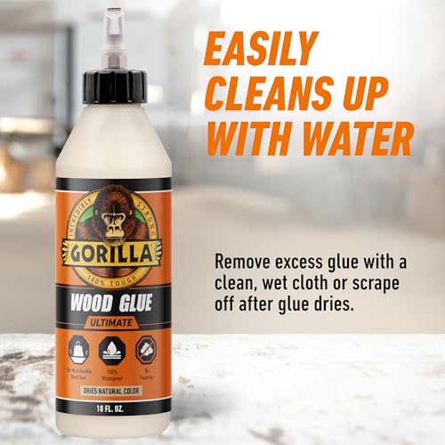 • Gorilla Ultimate Waterproof Wood Glue, Natural Wood Color, 18 Ounce (Pack of 1) - Waterproof for Indoor or Outdoor Projects and Repairs