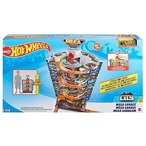 • Hot Wheels City Mega Garage Playset with Corkscrew Elevator & Storage for 60+ Cars, Includes 1 1:64 Scale Vehicle, Gift for Kids 4 Years Old & Up, HFH03