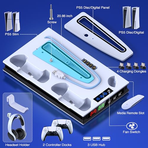 • PS5 Pro/Slim/Ps5 Stand and Cooling Station with Controller Charging Station for Playsation 5 Disc Digital Consoles, PS5 Accessories Incl. 3 Levels Cooling Fan, 3 USB Hub, Headset Holder, Media Slot