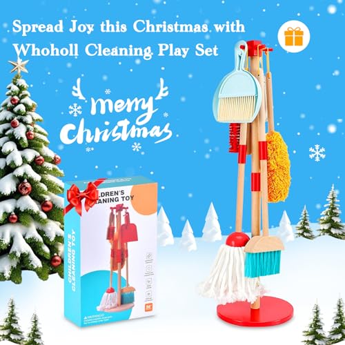 • WHOHOLL Wooden Kids Cleaning Toy Set Toddler Broom and Dustpan Set for Housekeeping 9 Pcs Broom and Mop Set for Toddlers 3-5, Baby Cleaning Toys with Sponge, Christmas Birthday Gifts for Boys Girls