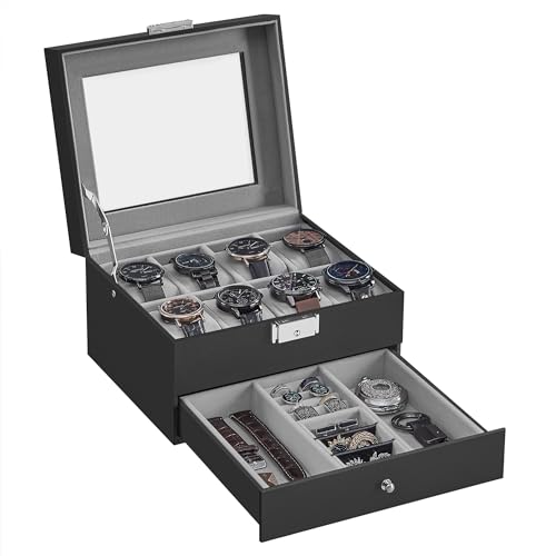 SONGMICS 8-Slot Watch Box, Lockable Watch Case with Glass Lid, 2 Layers, with 1 Drawer for Rings, Bracelets, Gift Idea, Black Synthetic Leather, Greenish Gray Lining UJWB080G01, Black + Gray, 8 Slot