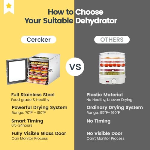 • Cercker Food-Dehydrator Machine 8 Stainless Steel Trays, 500W Jerky Dehydrator for Meat, 190ºF Mushroom Dryer, 24H Timer Fruits Dryer for Herbs, Veggies, Yogurt & Dog Treats