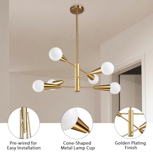 • KAISITE Sputnik Chandelier Modern Gold Chandelier 6-Light E26 Mid Century Ceiling Light Fixture Height Adjustable Hanging Pendant Lighting for Dining Room Kitchen Island Bedroom Office