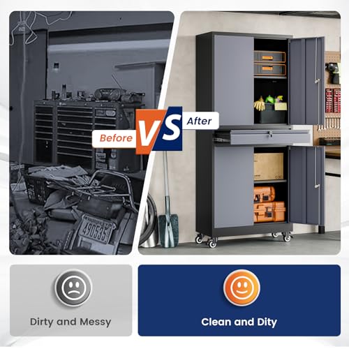 • Yizosh Metal Garage Storage Cabinet with Locking Doors and Adjustable Shelves, -73" Steel Rolling Tool Storage Cabinet with 4 Wheels and 1 Drawer for Garage,Office,Warehouse