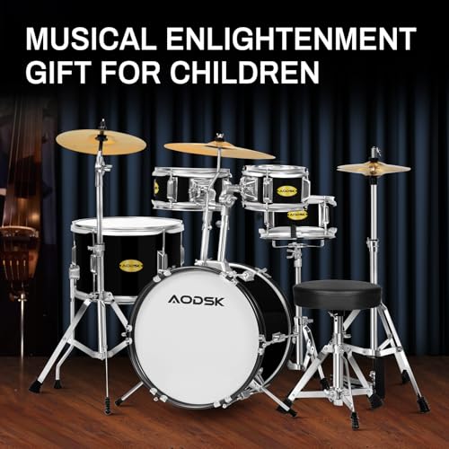 • AODSK Kid Drum Sets 5-Piece for Beginners, 14 inch Full Size Complete Drum Kit with Adjustable Throne, Cymbal, Hi-Hat, Pedal & Drumstick, Black
