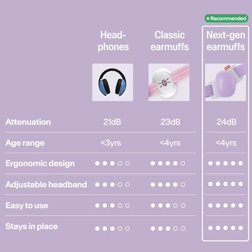 • Alpine Muffy Baby Comfort - Protects Hearing for Babies and Toddlers - CE & ANSI Certified - Unique Headband for Safe fit & Comfort, Multi-adjustable for Ages 3-48 Months, 24dB Sound Reduction, Purple