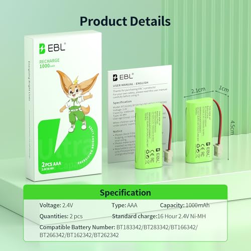 • EBL BT183342/BT283342 2.4V 1000mAh Ni-MH Battery, Compatible with AT&T VTech Cordless Phone Batteries BT166342/BT266342 CS6709 CS6609 CS6509 CS6409 EL52100 EL50003 (Pack 2) Green