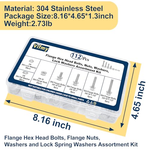 • Vifmy 3/8-16 Bolt x (Length 3/4", 1", 1-1/4", 1-1/2") 304 Stainless Steel Flange Head Bolts Assortment Kit (112 Pack) with 3/8 16 Bolt, Serrated Flange Nuts, Washers, Full Thread