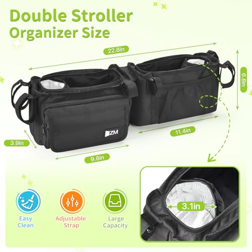 • ZZM Double Stroller Organizer with 2 Cooler Pockets,Compatible for Bob Duallie, Jeep and Baby Jogger City Mini GT2, Double Baby Stroller Accessories, Parent Console Double Jogging Stroller Organizer