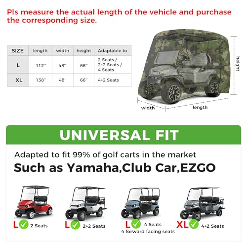 • 10L0L Golf Cart Cover 2/4/4+2 Passenger for Yamaha EZGO Club Car, Heavy Duty 420D Waterproof Windproof Durable Polyester Golf Cart Cover with 3 Zipper Doors for All-Weather Protection - Camouflage