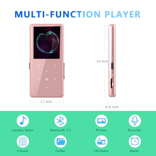 64GB MP3 Player with Bluetooth 5.2, AiMoonsa Music Player with Built-in HD Speaker, FM Radio, Voice Recorder, HiFi Sound, E-Book Function, Earphones Included, Rose Gold - 64GB