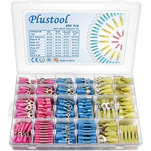 • 650 PCS Heat Shrink Connectors, Plustool Electrical Wire Terminals Kit Waterproof Butt Connectors Insulated Marine Crimp Automotive Connectors Wire Terminals Kits