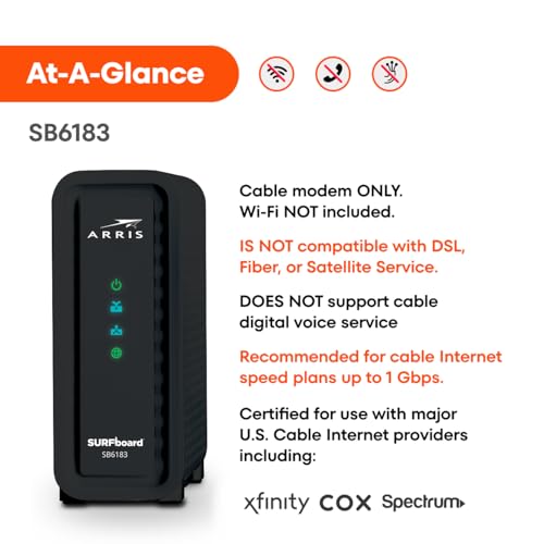 • ARRIS (SB6183) Cable Modem - Fast DOCSIS 3.0 16x4 Gigabit Cable Modem, For Comcast Xfinity, Cox, Spectrum and more, 1 Gbps Port, 400 Mbps Max Internet Speed, 1 Year Warranty
