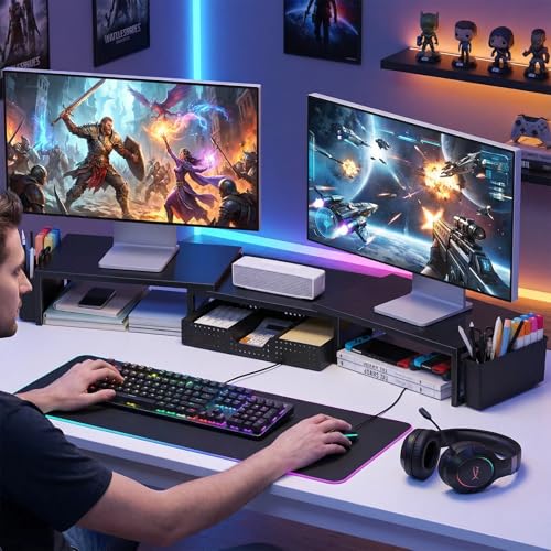 • OPNICE Desk Organizers and Accessories, Dual Monitor Stand Riser with Drawer and 2 Pen Holders, Desk Shelf Metal Computer Racks for Office Workspace Organizers, Desktop Organization (Black)